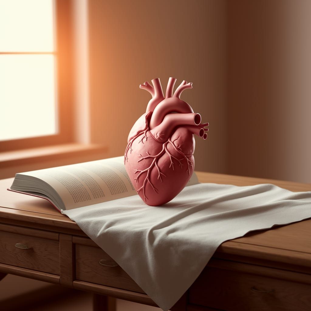 This serene image depicts a human heart on a wooden desk, surrounded by a medical textbook and warm, golden light. Rendered in stunning digital art, the scene exudes a sense of calm and contemplation.