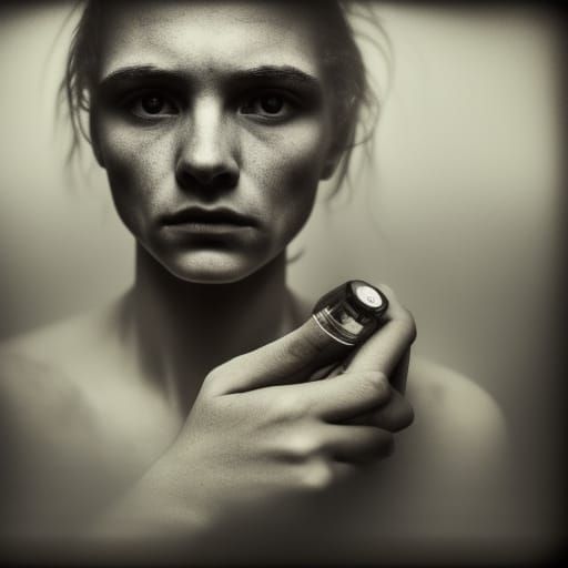A close-up picture shows a glass bottle, a note, a brown book. The image is lit with ambient light, reminiscent of the photographic styles of Lee Jeffries.
