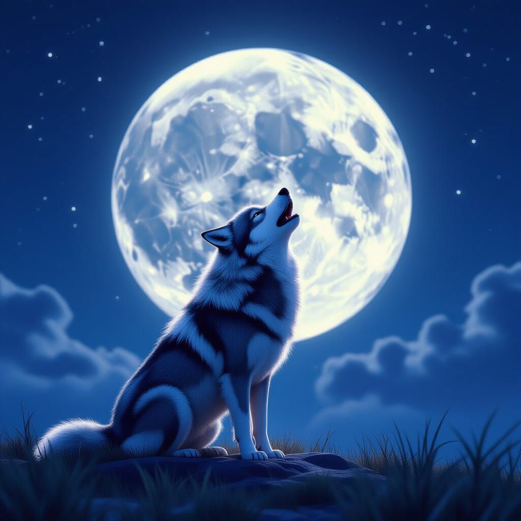 This image shows a majestic wolf howling at a luminous full moon under a dark night sky. Rendered in a detailed 3D anime art style with cinematic lighting and cool blues and silvers.