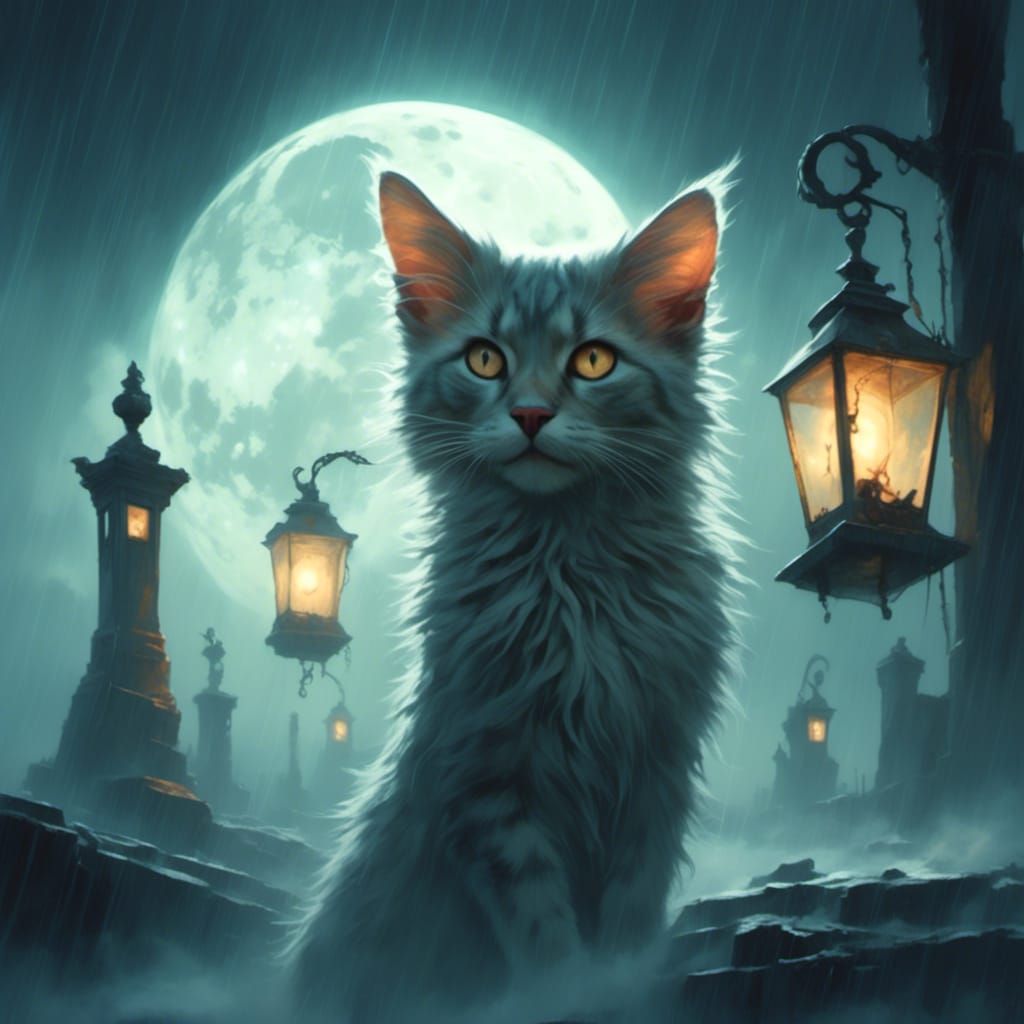 A digital rendering of glowing, translucent cats levitating in a misty, moonlit scene. The artwork features soft, ethereal glows and intricate mystical details in a dreamlike aesthetic.