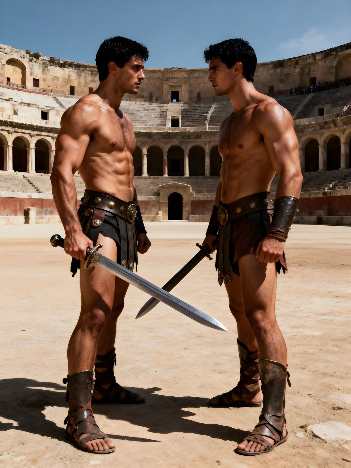 This hyperrealistic image shows two muscular, shirtless gladiators in a Roman arena, swords drawn at noon. High contrast and sharp focus create a dramatic, cinematic scene.