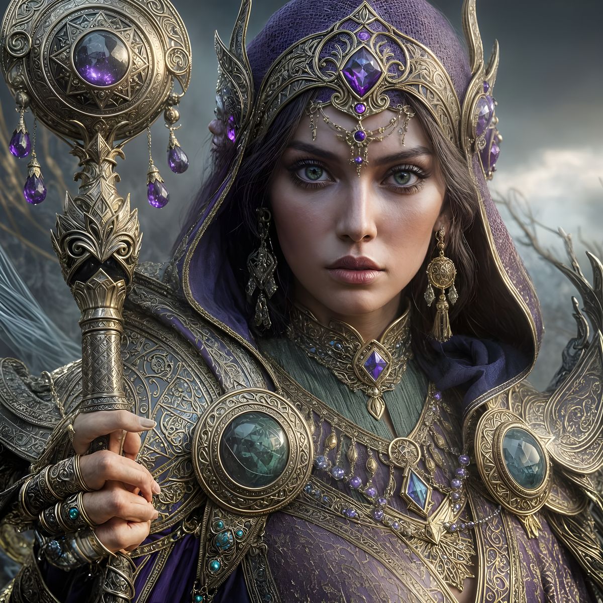 Generate your own hyper-realistic portraits of powerful female sorceresses in ornate armor with our free AI image generator.