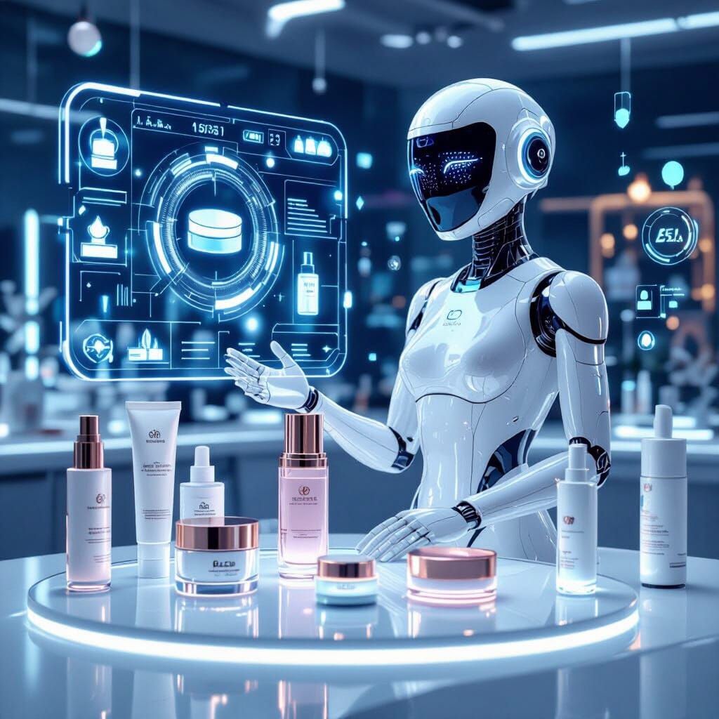 This image showcases a holographic AI assistant offering skincare advice next to elegant cosmetic products in a futuristic lab, featuring a bright, clean aesthetic.