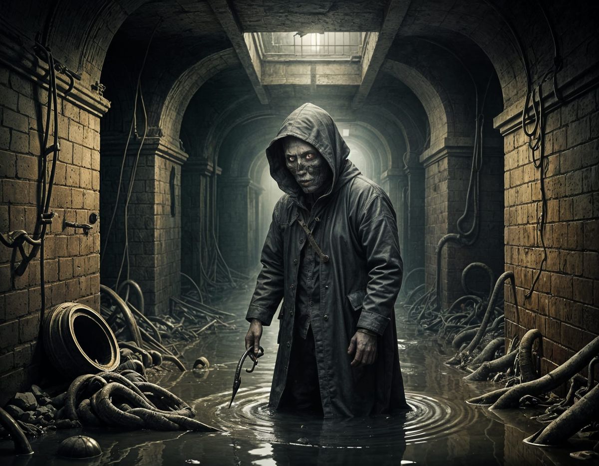 This image depicts dark creatures lurking in a sewer, rendered in a surreal and photorealistic style. The concept art evokes a sense of damage and loss within a distorted reality.