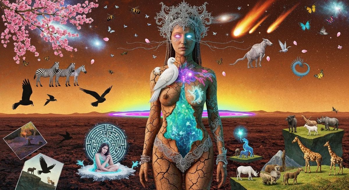 This image depicts a mystical shaman with cracked skin revealing bioluminescent liquid, interwoven with a white bird. The scene features a barren landscape, cosmic elements, and diverse wildlife under a copper sky, presented as a surreal photomontage.