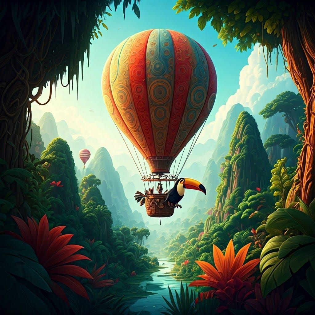 This vibrant image depicts a toucan piloting a hot air balloon over a colorful jungle landscape, teeming with exotic plants and animals, in a playful and intricate na"ive art style.