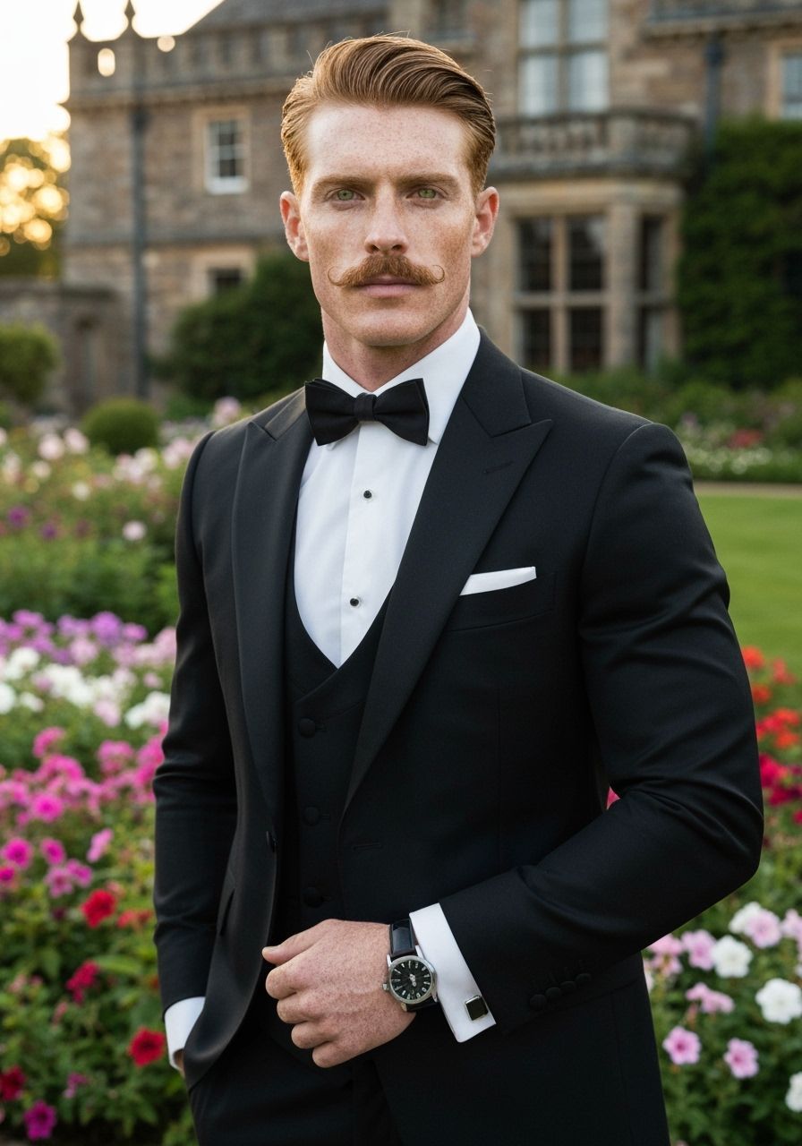 This photorealistic image shows a muscular man with ginger hair and green eyes in a tuxedo, standing in a vibrant flower garden. Soft golden hour light creates a warm, inviting atmosphere with beautiful bokeh.