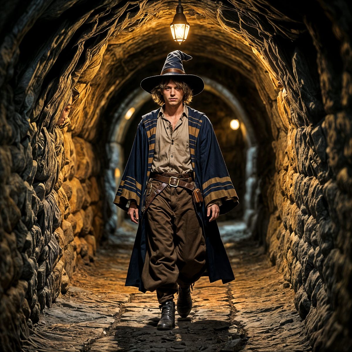 A cautious young wizard apprentice with curly hair and oversized robes explores a rough-hewn underground passage. Golden light ahead casts long shadows.