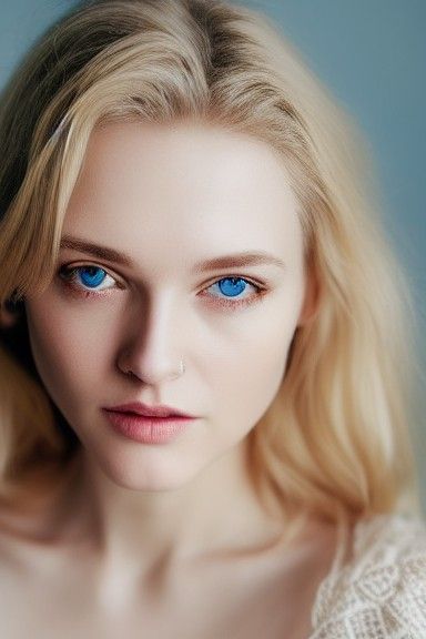 This image shows a portrait of a beautiful blonde woman with striking ice-blue eyes. She has a slight, innocent smile and wears a blue silk blouse with intricate gold detailing.