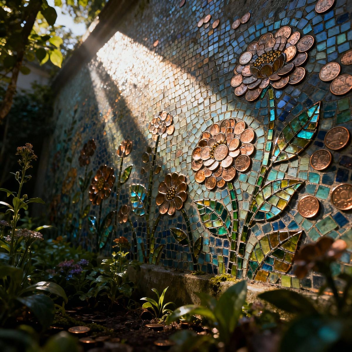 A detailed digital painting showcases a garden mural constructed from coins. Sunlight highlights the metallic textures and mosaic-like patterns of flowers and leaves in this vibrant scene.
