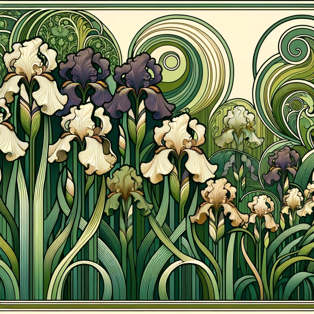 This image showcases a lush garden filled with iris flowers, rendered in an elegant Art Nouveau style. Rich greens and flowing lines create a decorative and harmonious ornamental composition.
