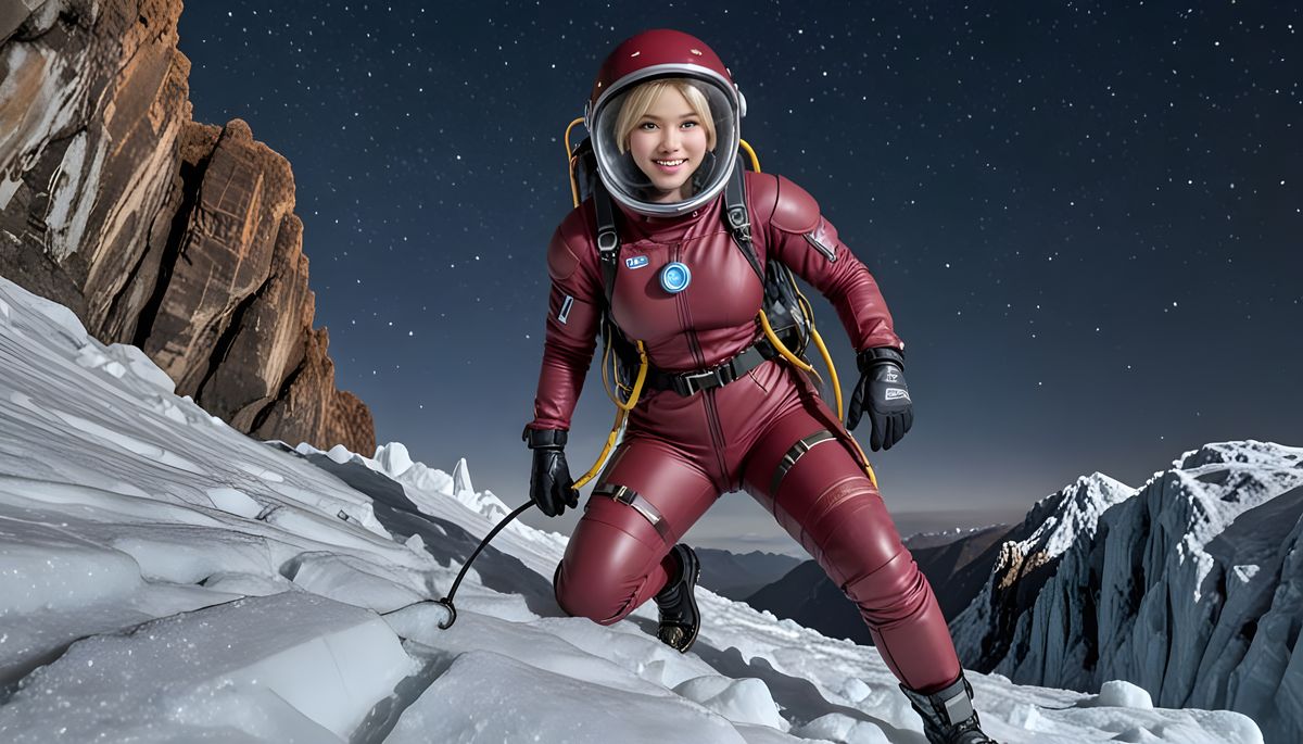 A realistic image of a smiling, blonde-haired woman in a form-fitting spacesuit climbing a steep icy cliff on a frozen world at night. The image is highly detailed in 8k resolution.