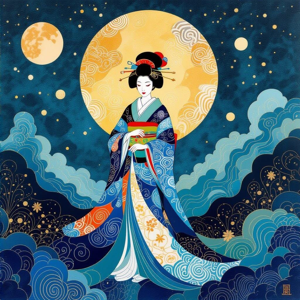 This image depicts a lady dancing in a vibrant, psychedelic universe. It blends styles of Japanese ink wash, Aboriginal dot painting, and fluid silk art with ethereal, dreamy, and mystical qualities.