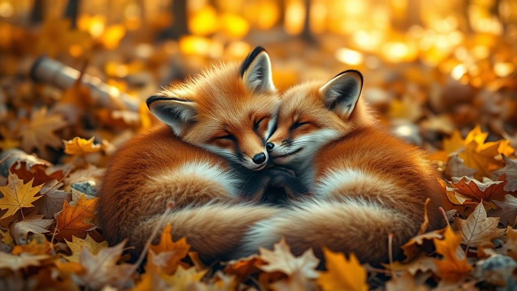 This hyper-detailed photograph captures two red foxes embracing warmly amid golden maple leaves. Soft sunlight and crisp air create a cozy, award-winning wildlife photography scene.