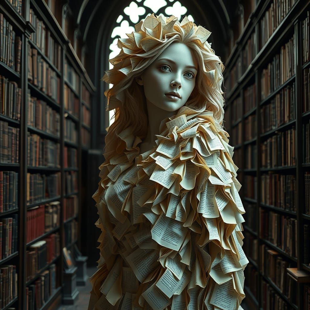 This image features a sculpture of a woman crafted from book pages, set within an old gothic library. The photograph highlights her mysterious and ethereal presence.