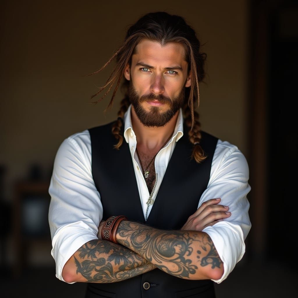 A captivating portrait captures a man exuding confidence and style. His braided hair cascades down, framing a face with striking blue eyes that command attention. He sports a well-groomed beard that adds to his rugged charm. Dressed in a crisp white shirt and a sleek black vest, his attire is both classic ...