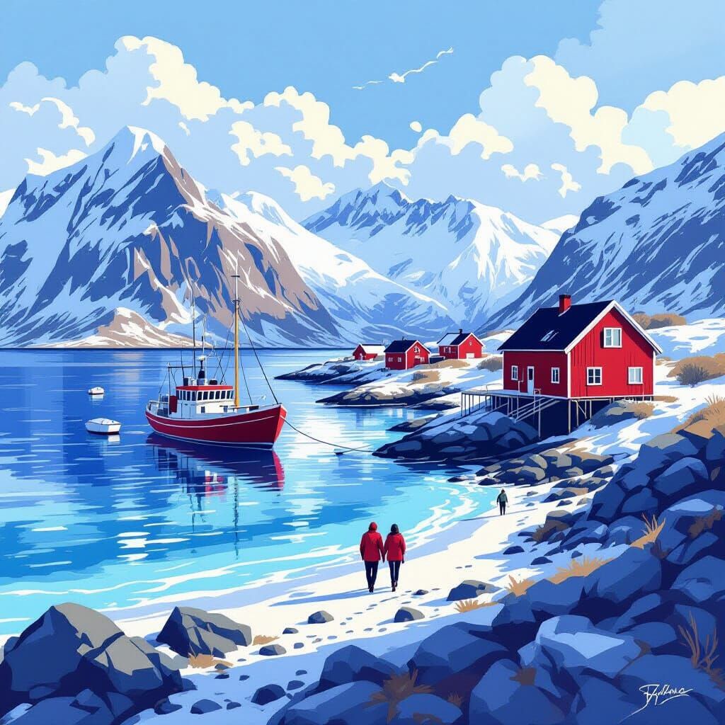 This image shows a cozy and warm illustration of a Norwegian fishing village in Lofoten. Red and yellow rorbu houses are set against a rocky shore with snow-capped mountains and clear blue sea.