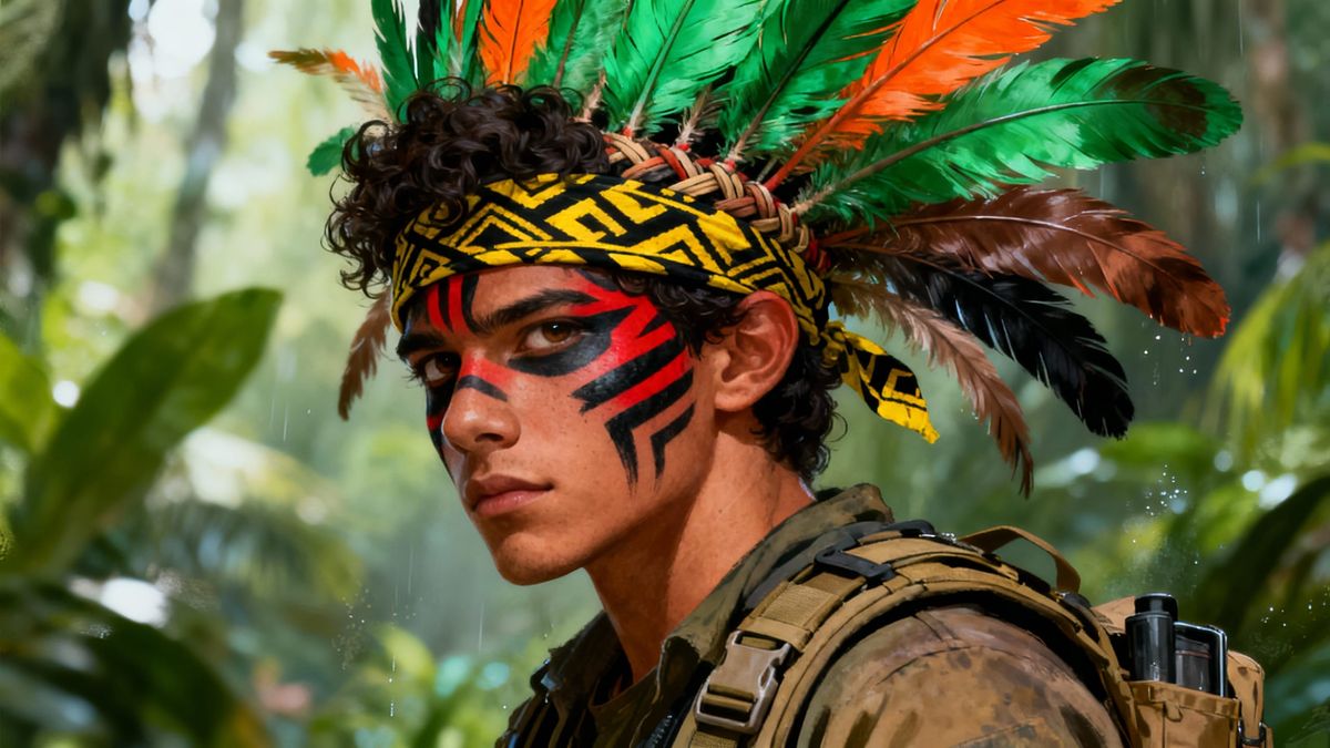 A hyperrealistic portrait of a young man with tribal face paint and a vibrant feathered headdress in a rainforest. The art features intricate detail and dramatic lighting.