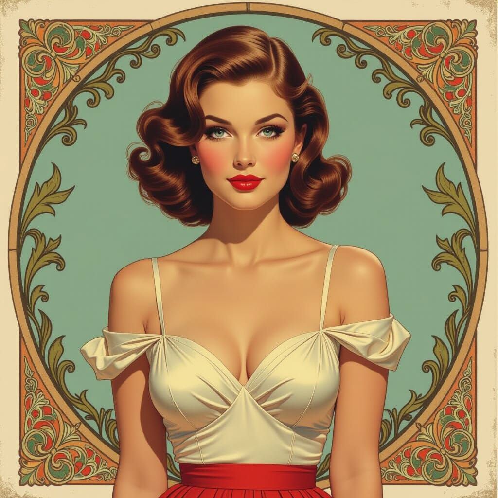 A captivating image of a 1950s pin-up girl exuding confidence. This artwork blends idealized naturalism with soft focus and atmospheric elements, reminiscent of tonalist oil paintings.