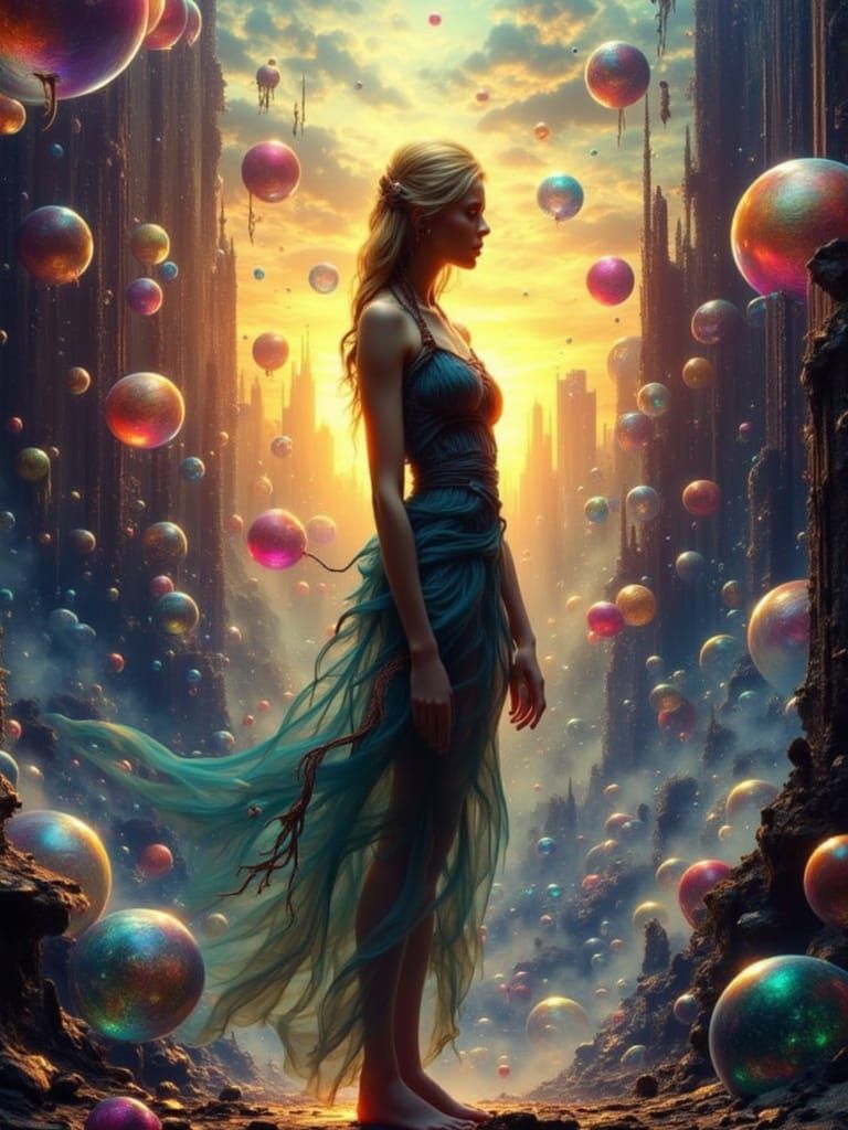 A hyperrealistic image of a lone woman in a ruined, overgrown city. Giant iridescent bubbles float around her, illuminated by a soft sunset glow.