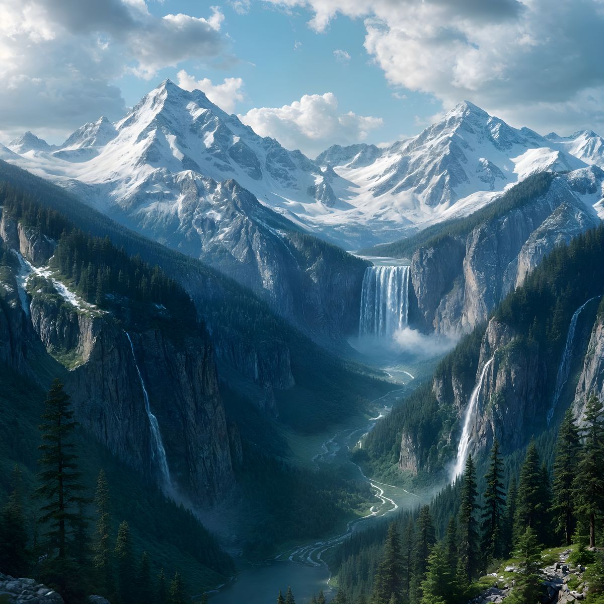 This image shows a dramatic mountain landscape featuring numerous waterfalls, snow-capped peaks, lush pine forests, and deep valleys. The scene is a detailed digital painting with a cinematic and atmospheric feel.