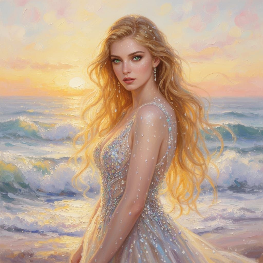 Portrait of a stunningly beautiful woman with long, flowing golden hair and piercing green eyes, standing near the ocean during a sunset, wearing a shimmering, ethereal gown with intricate beadwork and sparkling details, water droplets glistening on her skin and hair, waves crashing in the background, warm golden hour lighting, soft focus, dreamy and romantic atmosphere, fantasy aesthetic, detailed facial features, elegant and graceful pose, cinematic composition, 8k resolution, photorealistic, soft pastel colors, bokeh background.