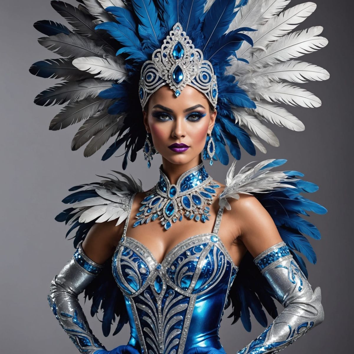 A showgirl with a feather headress on her head with gloves up to her elbows, and the entire outfit is silver and blue, with a shimmer and sh...