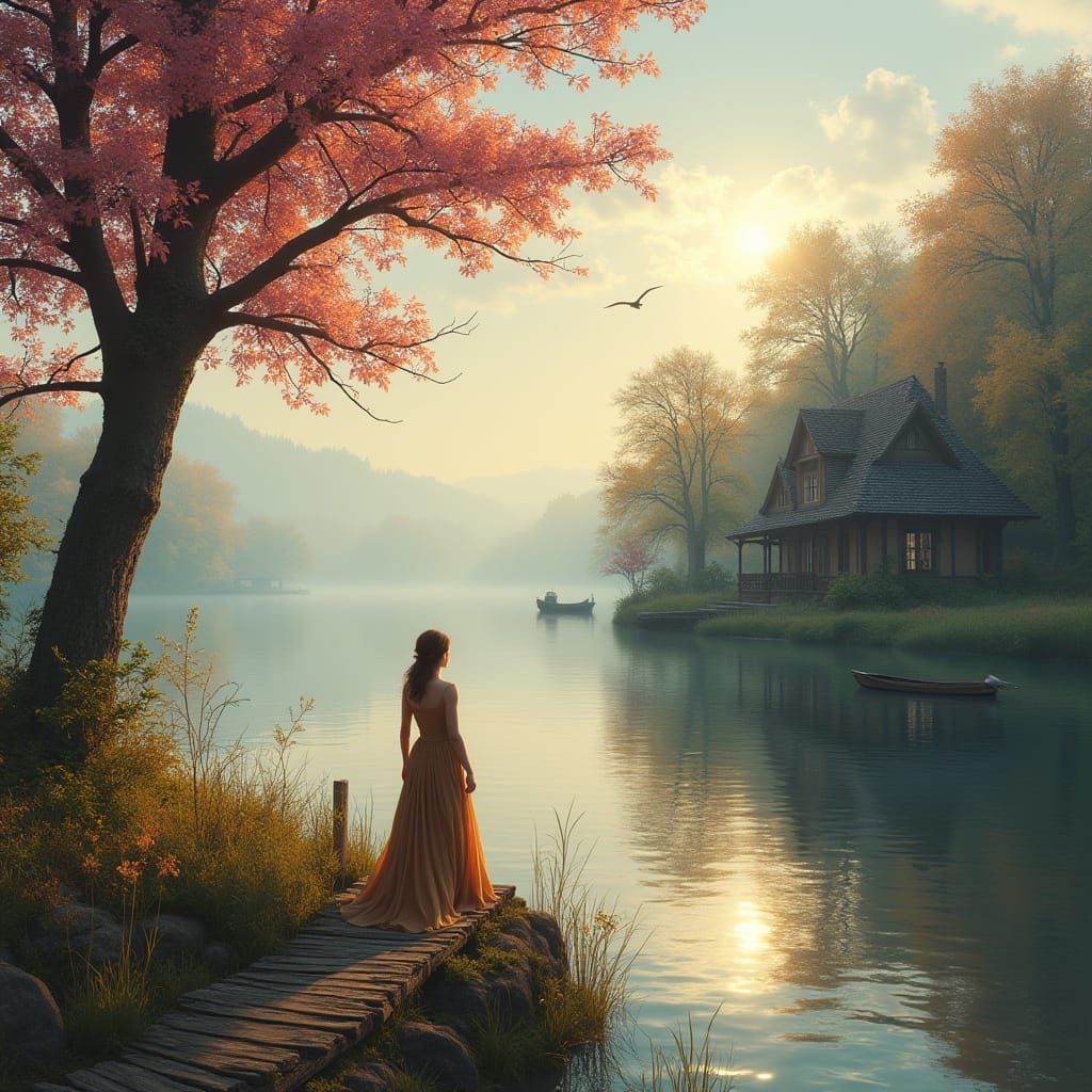 This image depicts a rustic French cottage by a misty lake, bathed in golden light. A woman strolls by the water as a bird flies, rendered in a romantic, painterly style with vibrant, muted colors.