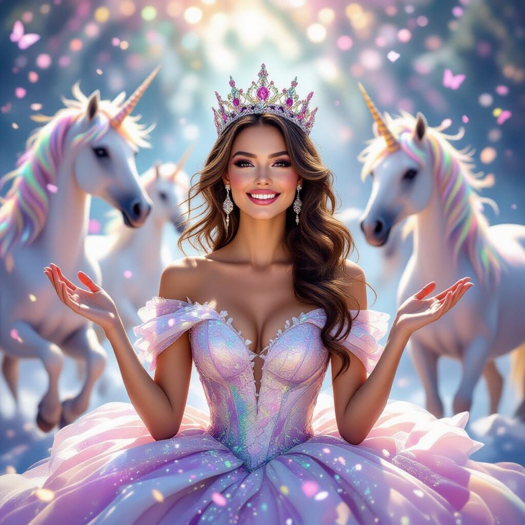 A queen joyfully celebrates her birthday surrounded by unicorns, glitter, and confetti. This dreamy digital matte painting features iridescent fabrics and a magical glow, rendered with exquisite detail.