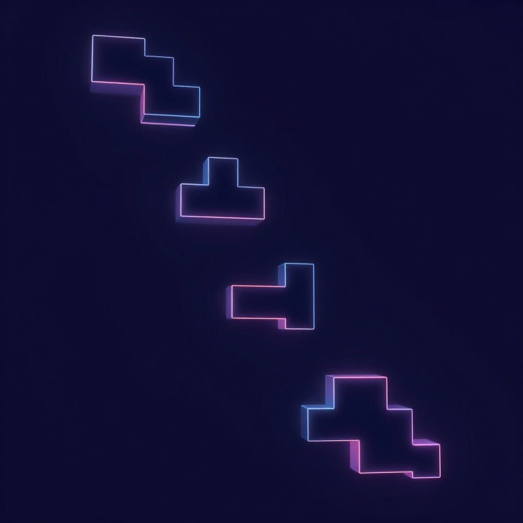 This image shows a dynamic cascade of glowing Tetris blocks in a dark, atmospheric void. Rendered with neon outlines and soft light, it evokes minimalist digital art.