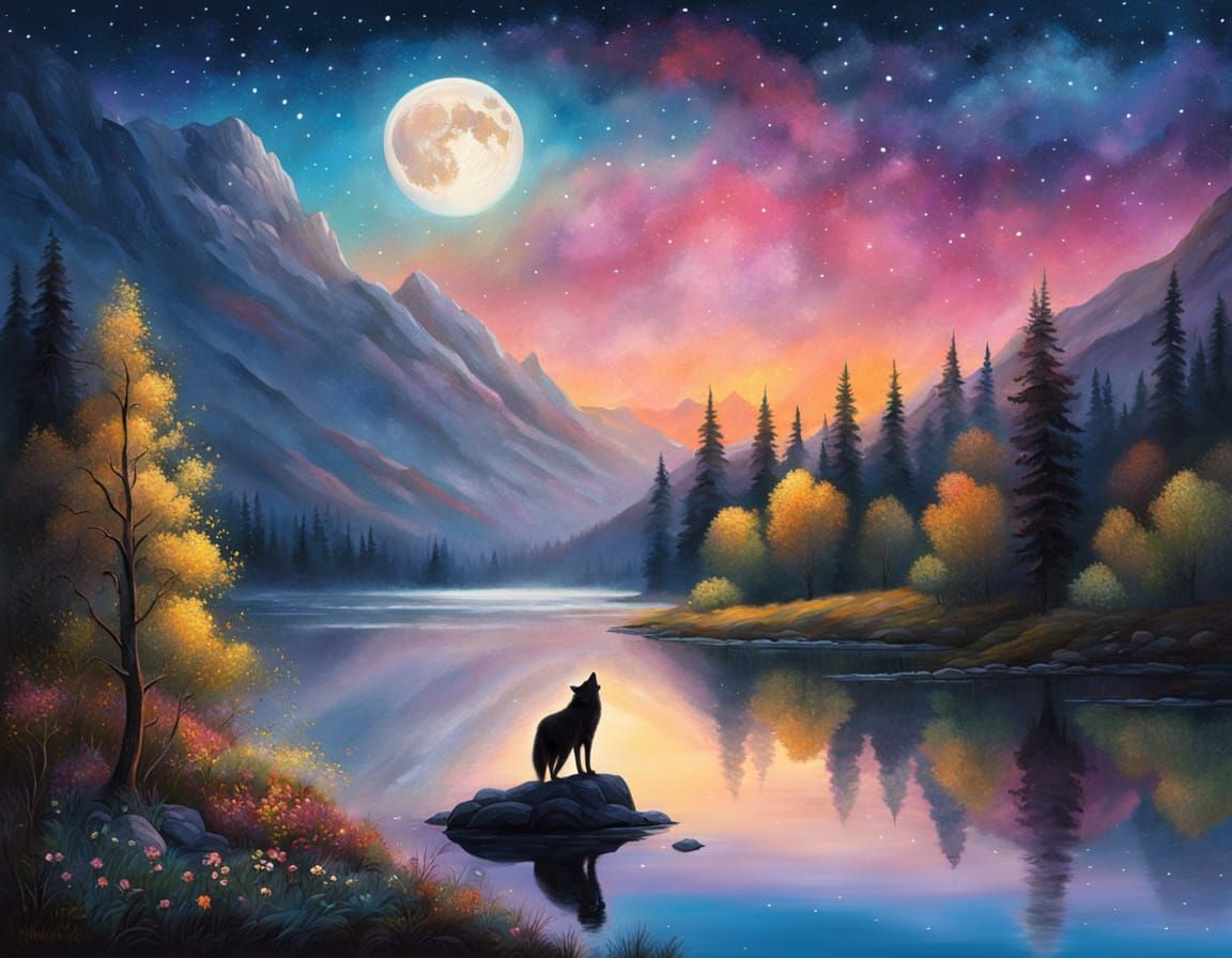 A vibrant oil painting of a wolf by a moonlit lake. Soft brushstrokes and golden hour lighting create a mystical, dreamlike landscape with colorful mountains and intricate details.
