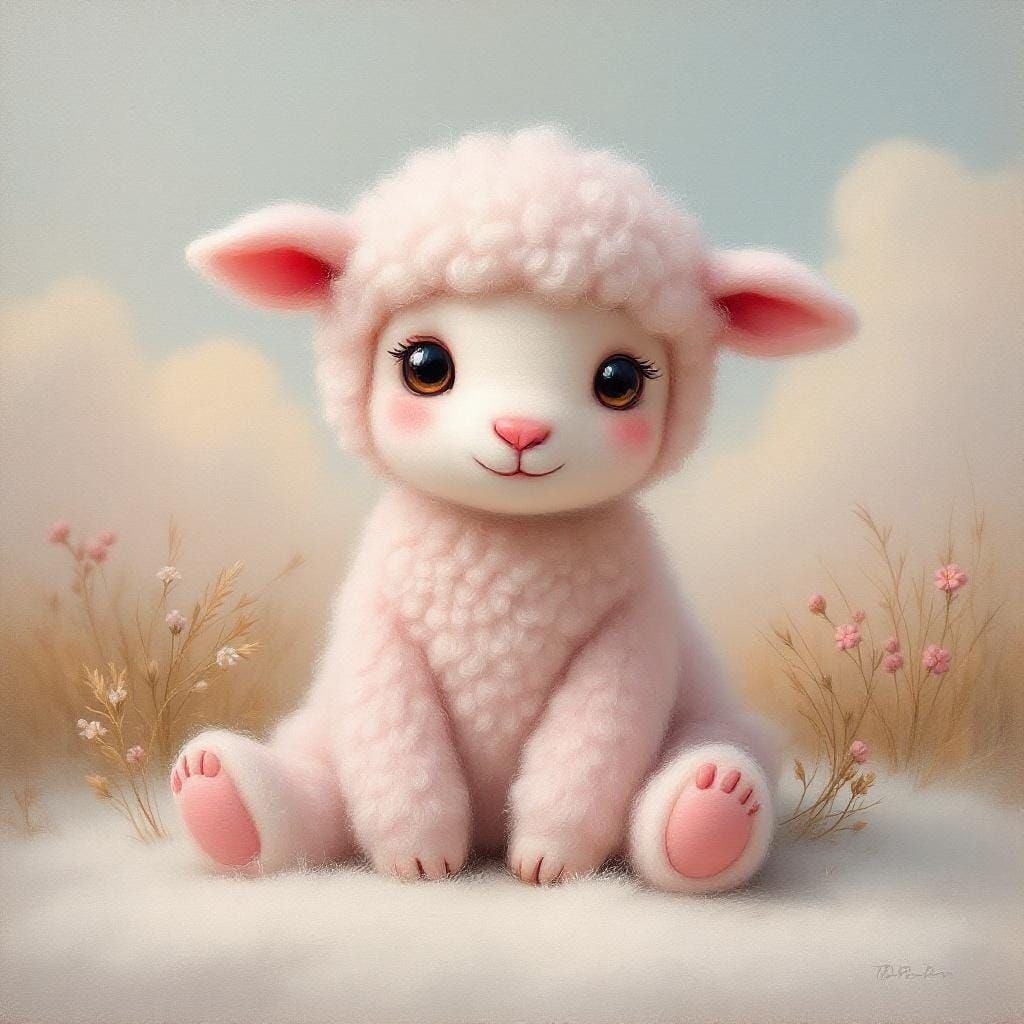 A soft, pastel pink felted lamb with a chibi face sits in a serene landscape. The image evokes the gentle style of oil paintings, with muted colors.