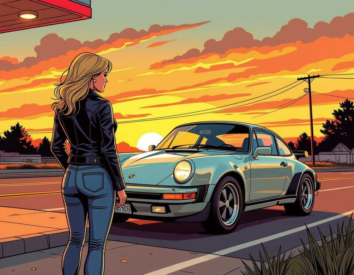 This image shows a blonde woman in a leather jacket leaning against a vintage Porsche at a diner during sunset. The artwork is a hand-drawn comic style with vibrant colors and bold lines.