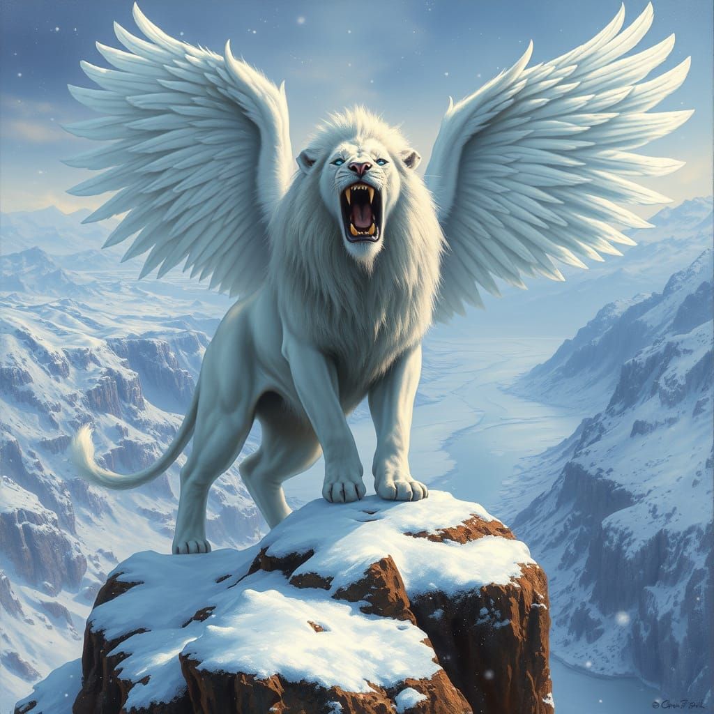A majestic winged lion with a white mane stands on a snowy cliff. The fantastic creature overlooks a vast, snow-filled valley with a frozen river, rendered as dramatic fantasy art.