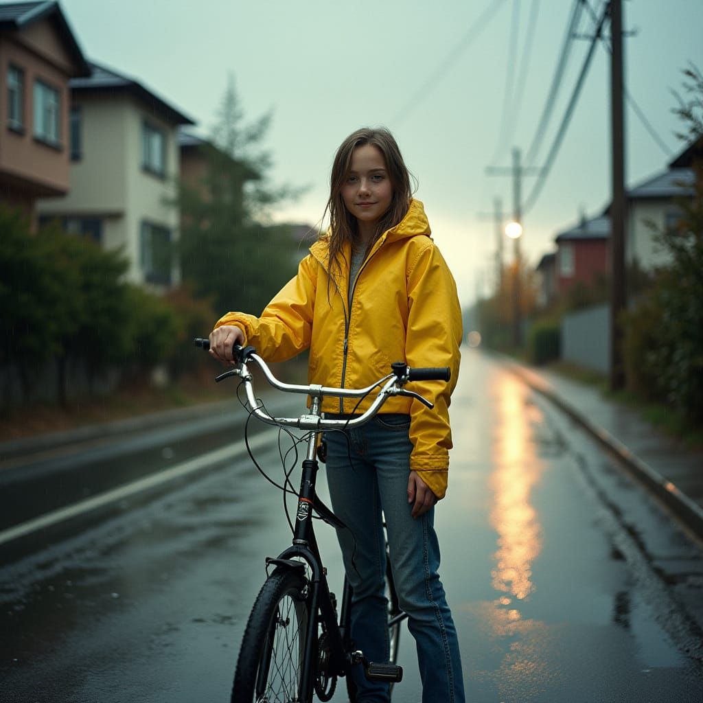 This image shows a young girl confidently standing beside her sleek bicycle on a deserted street, with the sun breaking through the grey clouds and casting a warm glow, evoking a sense of nostalgia and drama, in a cinematic film still style with subtle film grain and rich colors.