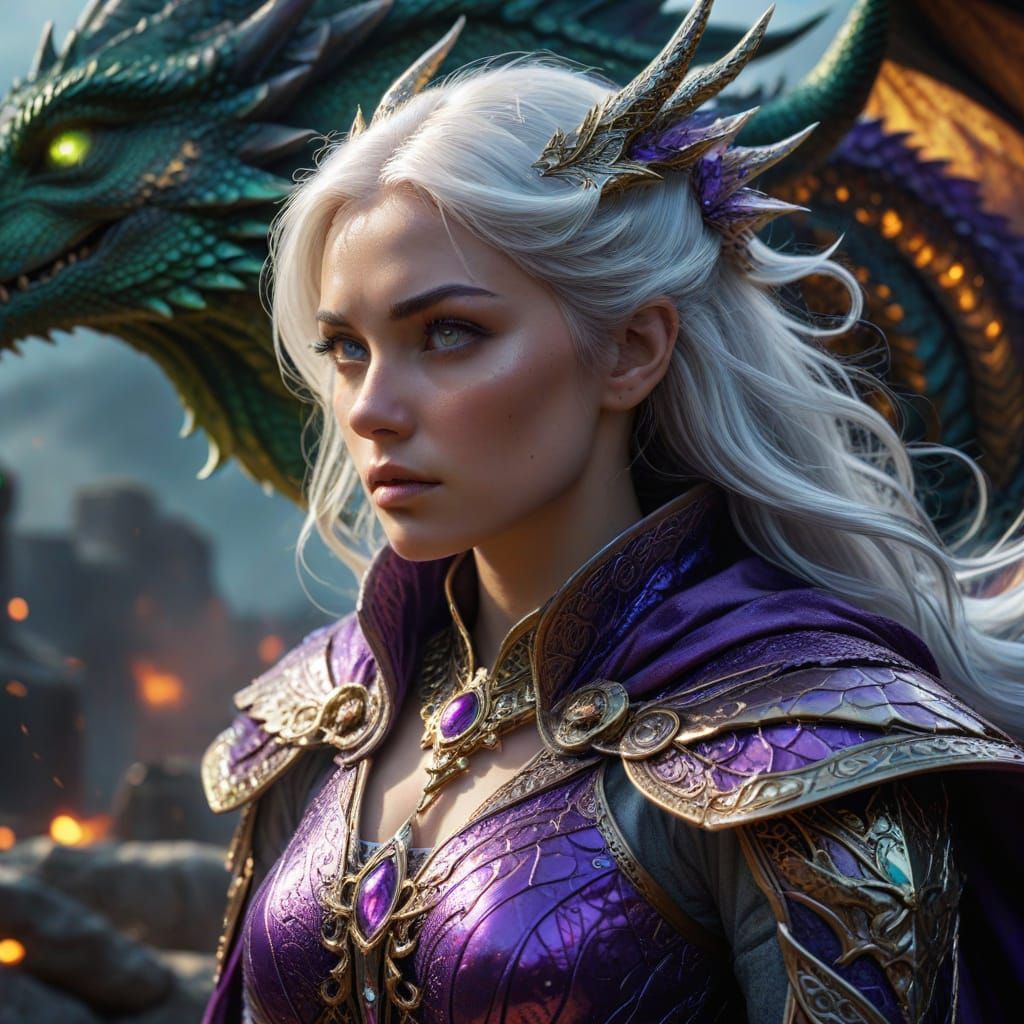 This image shows a fierce princess in battle, riding a majestic holographic dragon through a fantasy environment. The princess wears a gilded purple cloak with intricate patterns and displays determination in her green eyes. The scene is captured in high detail with vibrant colors and dynamic motion.