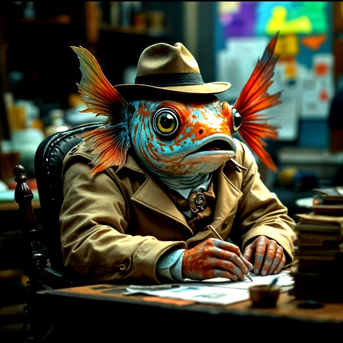 This hyperrealistic image shows a fish in a trench coat and hat at a desk. Concept art with intricate detail and dramatic lighting creates a colorful, engaging scene.