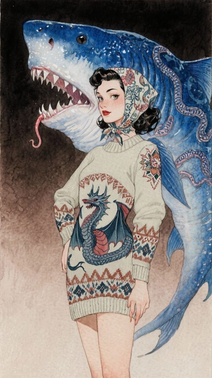 A limited-palette water-colour painting of a young woman (wyvern-pattern sweater-dress; hydra-pattern headscarf; manticore-pattern tattoos) standing in front of an anglerfish/megalodon hybrid. Indigo/taupe gradient lighting; intricate details; perfect anatomy; pinup style