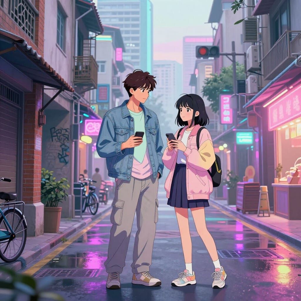 This image captures Shenzhen youth in a 1990s urban street scene, rendered in a high-quality anime and manhwa style with subtle Chinese influences. The scene evokes urban noir vibes with elegant poses and detailed city elements.