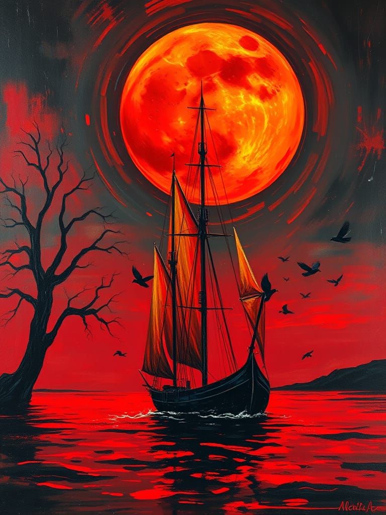 A dramatic image of a tall ship sailing on dark waters under a colossal moon. The eerie scene is reminiscent of expressionist paintings, with vibrant colors and thick impasto textures.