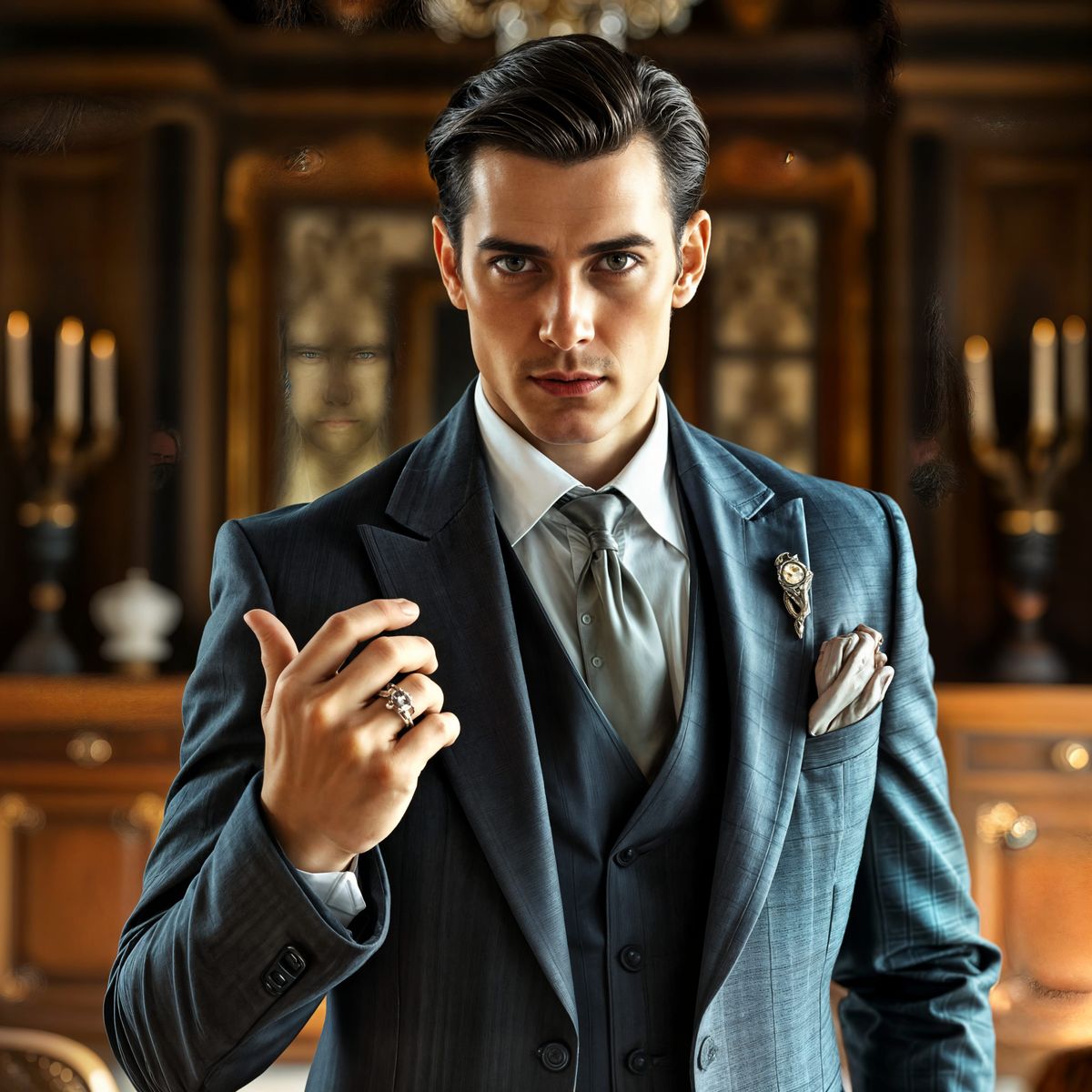 This image features a refined, 2,036-year-old vampire with Germanic beauty, standing in a luxurious setting, showcasing his elegant attire and regal presence.
