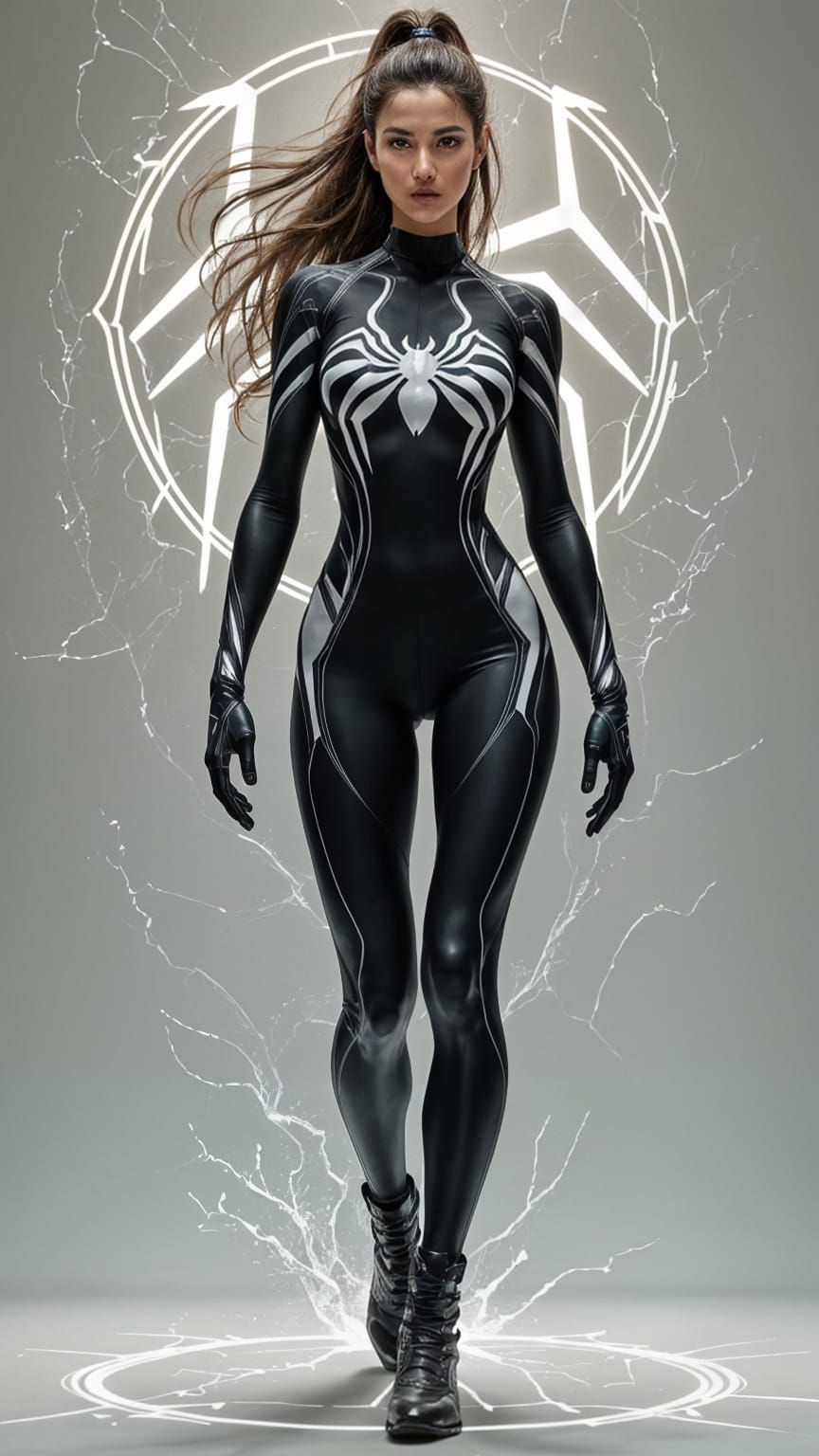 This image showcases a full-body cinematic portrait of Anya Corazon in a sleek, modernized comic suit. The athletic heroine displays graceful balance and quiet strength, with subtle spider motifs.