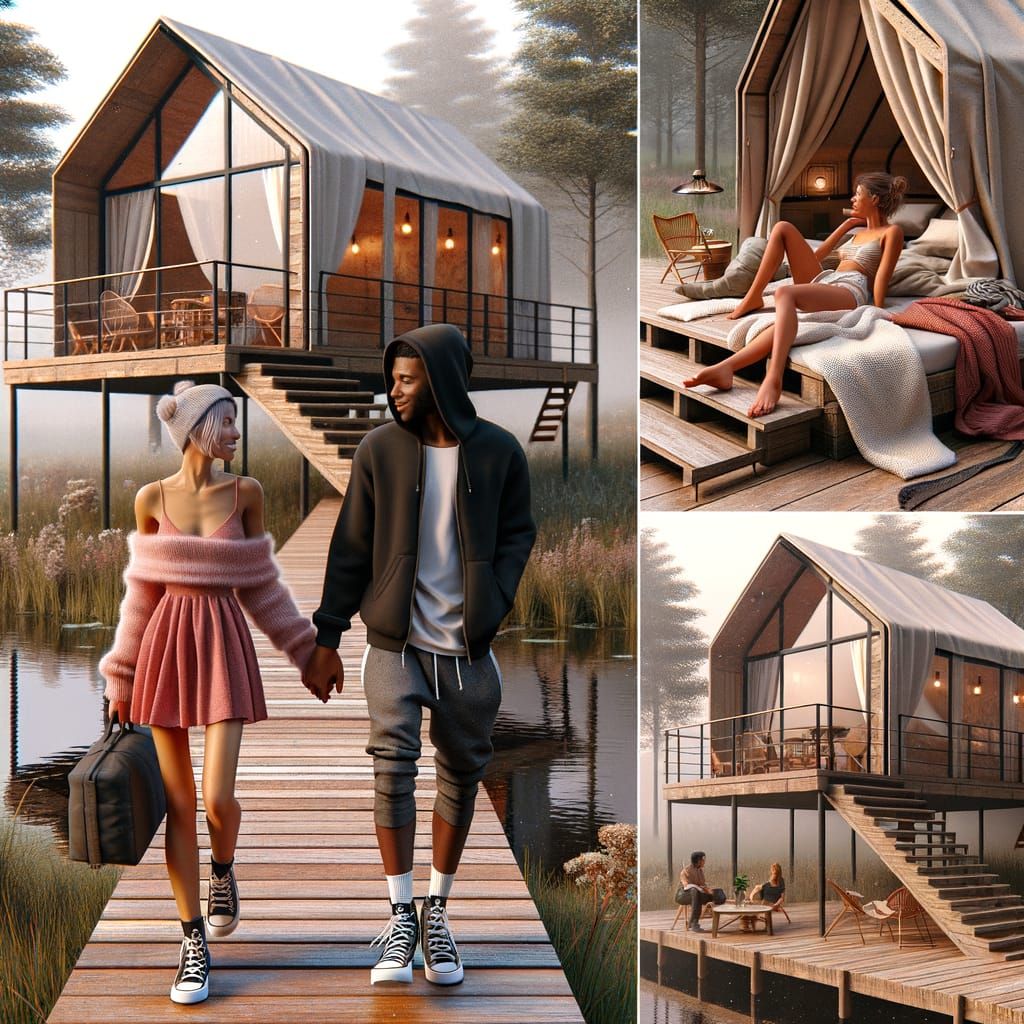 A serene glamping site with elevated tiny houses, surrounded by nature and a lake, featuring a romantic couple in relaxed poses amidst various times of day and weather conditions.