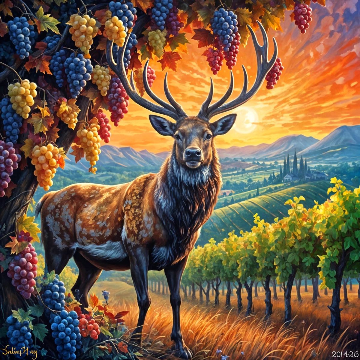 A majestic stag wanders through a lush vineyard at sunset. The image captures the warmth of the light and the intricate details of the grapes and vines, realized with triadic colors in an oil on canvas style.