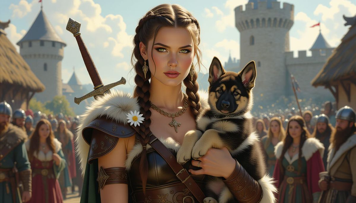 A Viking woman with dark braided hair and edelweiss flowers, holding a German Shepherd puppy. She stands before a medieval castle in a dramatic style with vibrant colors.