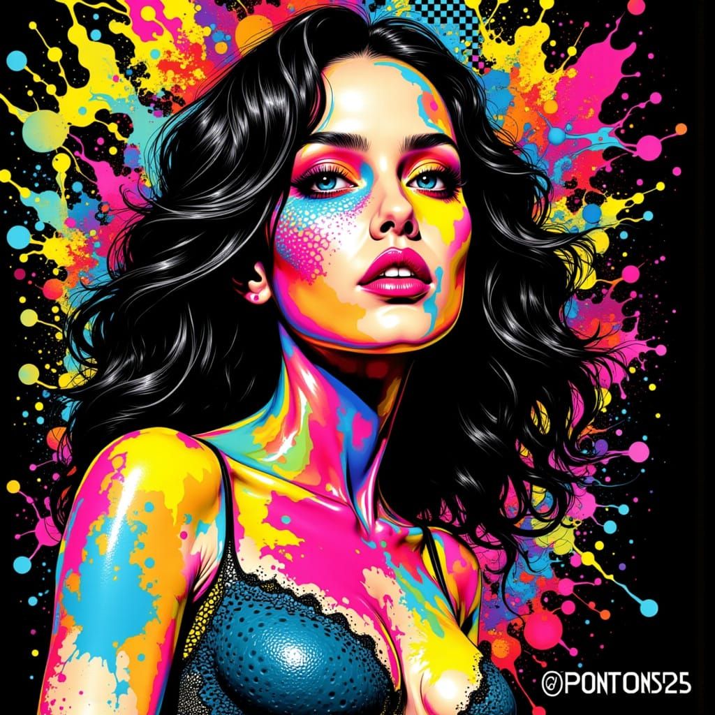 This vibrant pop art portrait features a confident Hispanic woman with ink splashes and Ben-Day dots. Bold outlines and contrasting colors create a dynamic comic book aesthetic.