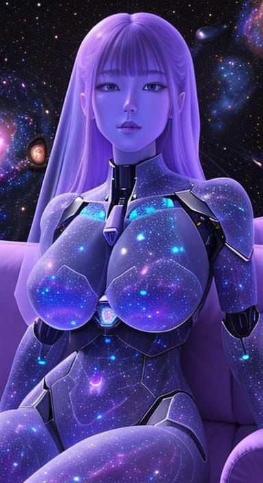 This image shows a translucent, colossal female mecha figure with celestial features stretching across galaxies. She is depicted in a massurrealist line art style, with a sofa bed floating in the background.