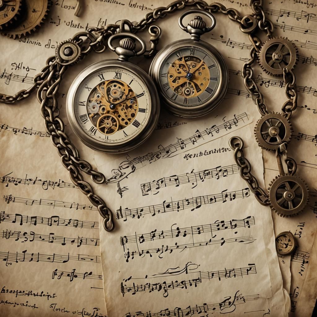 This image shows an antique pocket watch on a table with parchment music notes in the background. A steampunk engine adds a unique, industrial-inspired aesthetic.