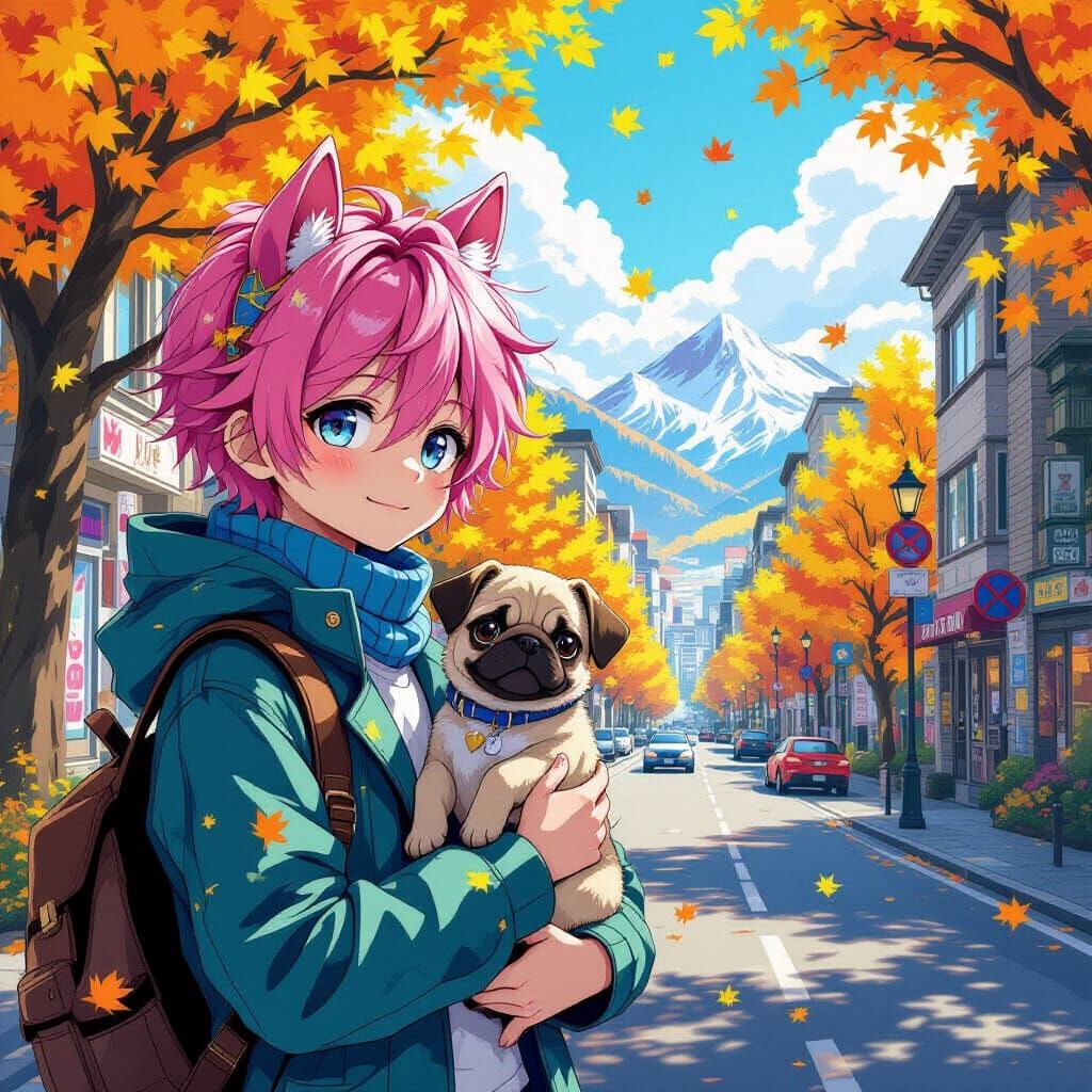 This image depicts a whimsical anime boy with pink hair and horse ears on a city street. He gently holds a pug puppy amidst vibrant autumn leaves and a dreamy landscape, rendered with energetic colors and mixed media techniques.