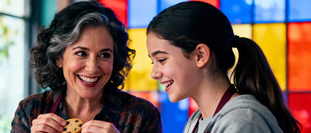 This is a hyperrealistic image of a smiling mother teaching her teenage daughter her secret cookie recipe. The photo features vibrant colors and intricate detail.